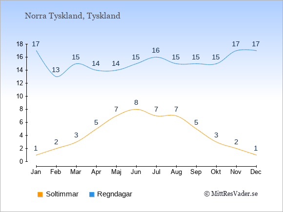 Grafen visar det genomsnittliga antalet soltimmar i Norra Tyskland under en viss månad (soltimmar är det antalet timmar per dag där solen skinnar), och antalet regndagar (dvs. det genomsnittliga antalet dagar