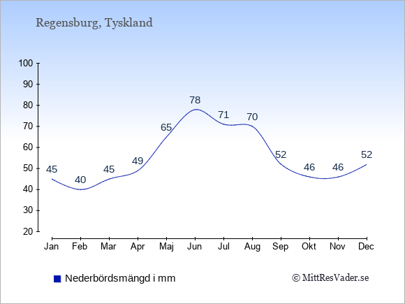 För att se hur vädret i Regensburg skiljer sig från vädret hemma, kan du också jämföra siffrorna måned för måned med motsvarande siffror för Sverige under samma period här: Regensburgs klimat.