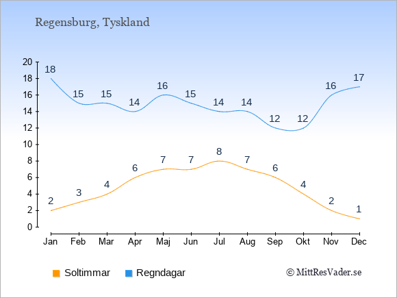 Grafen visar det genomsnittliga antalet soltimmar i Regensburg under en viss månad (soltimmar är det antalet timmar per dag där solen skinnar), och antalet regndagar (dvs. det genomsnittliga antalet dagar