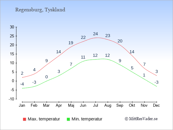 Grafen visar de genomsnittligt högsta temperaturerna i Regensburg (vanligtvis det värde som uppmätts mitt på dagen) och de genomsnittligt lägsta temperaturer (vanligtvis tidpunkten just innan soluppgång).
