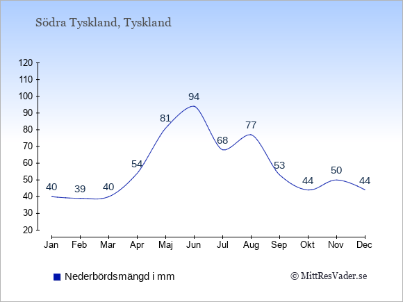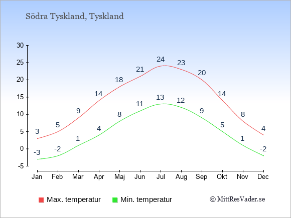 För att se hur vädret i Södra Tyskland skiljer sig från vädret hemma, kan du också jämföra siffrorna måned för måned med motsvarande siffror för Sverige under samma period här: Södra Tysklands klimat.