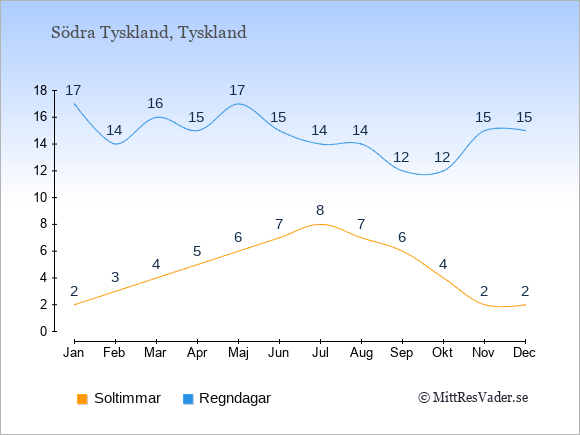 Grafen visar det genomsnittliga antalet soltimmar i Södra Tyskland under en viss månad (soltimmar är det antalet timmar per dag där solen skinnar), och antalet regndagar (dvs. det genomsnittliga antalet dagar