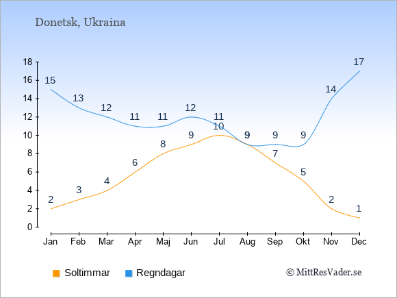 Grafen visar det genomsnittliga antalet soltimmar i Donetsk under en viss månad (soltimmar är det antalet timmar per dag där solen skinnar), och antalet regndagar (dvs. det genomsnittliga antalet dagar