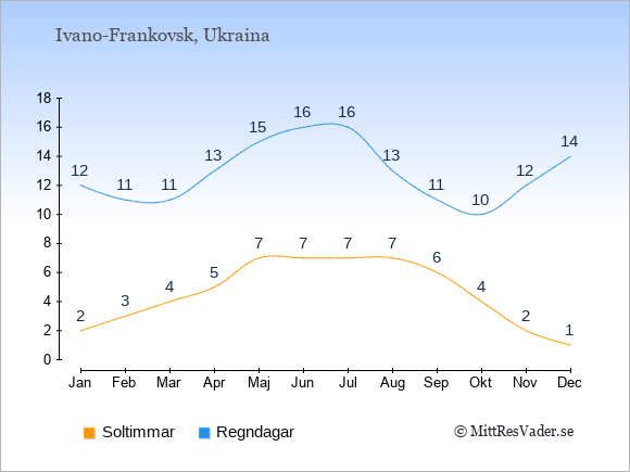Grafen visar det genomsnittliga antalet soltimmar i Ivano-Frankovsk under en viss månad (soltimmar är det antalet timmar per dag där solen skinnar), och antalet regndagar (dvs. det genomsnittliga antalet dagar