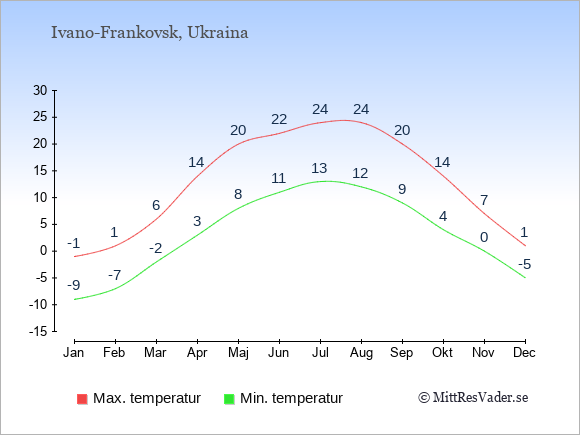 Grafen visar de genomsnittligt högsta temperaturerna i Ivano-Frankovsk (vanligtvis det värde som uppmätts mitt på dagen) och de genomsnittligt lägsta temperaturer (vanligtvis tidpunkten just innan soluppgång).
