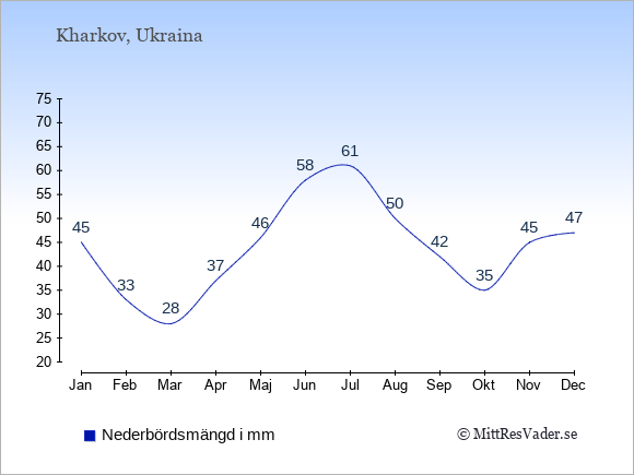 För att se hur vädret i Kharkov skiljer sig från vädret hemma, kan du också jämföra siffrorna måned för måned med motsvarande siffror för Sverige under samma period här: Kharkovs klimat.