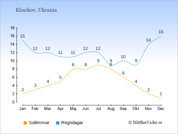 Grafen visar det genomsnittliga antalet soltimmar i Kharkov under en viss månad (soltimmar är det antalet timmar per dag där solen skinnar), och antalet regndagar (dvs. det genomsnittliga antalet dagar