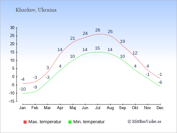 Grafen visar de genomsnittligt högsta temperaturerna i Kharkov (vanligtvis det värde som uppmätts mitt på dagen) och de genomsnittligt lägsta temperaturer (vanligtvis tidpunkten just innan soluppgång).