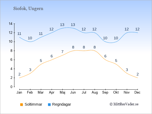 Grafen visar det genomsnittliga antalet soltimmar i Siofok under en viss månad (soltimmar är det antalet timmar per dag där solen skinnar), och antalet regndagar (dvs. det genomsnittliga antalet dagar