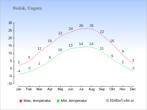 Grafen visar de genomsnittligt högsta temperaturerna i Siofok (vanligtvis det värde som uppmätts mitt på dagen) och de genomsnittligt lägsta temperaturer (vanligtvis tidpunkten just innan soluppgång).