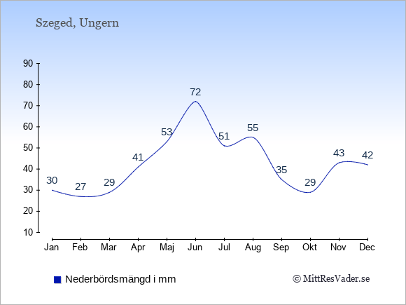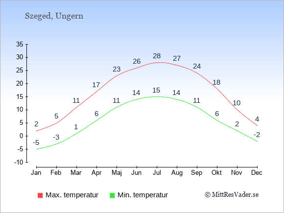 För att se hur vädret i Szeged skiljer sig från vädret hemma, kan du också jämföra siffrorna måned för måned med motsvarande siffror för Sverige under samma period här: Szegeds klimat.