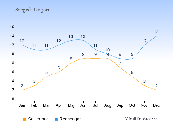 Grafen visar det genomsnittliga antalet soltimmar i Szeged under en viss månad (soltimmar är det antalet timmar per dag där solen skinnar), och antalet regndagar (dvs. det genomsnittliga antalet dagar