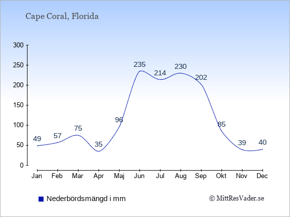 För att se hur vädret i Cape Coral skiljer sig från vädret hemma, kan du också jämföra siffrorna måned för måned med motsvarande siffror för Sverige under samma period här: Cape Corals klimat.
