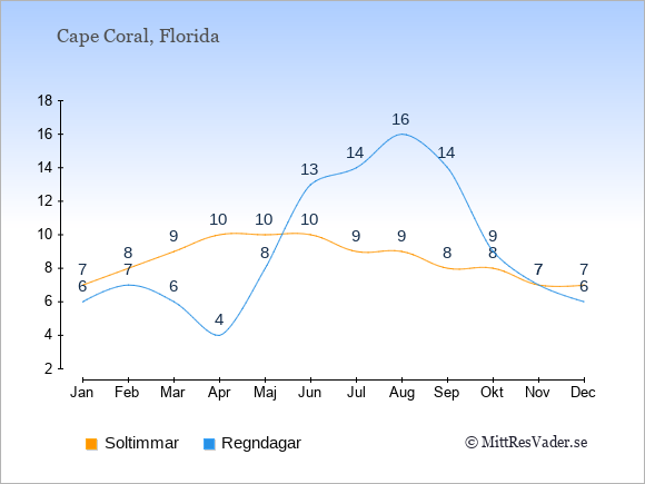 Grafen visar det genomsnittliga antalet soltimmar i Cape Coral under en viss månad (soltimmar är det antalet timmar per dag där solen skinnar), och antalet regndagar (dvs. det genomsnittliga antalet dagar
