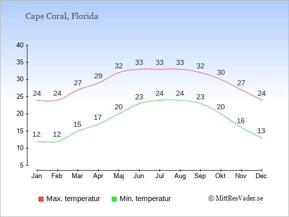 Grafen visar de genomsnittligt högsta temperaturerna i Cape Coral (vanligtvis det värde som uppmätts mitt på dagen) och de genomsnittligt lägsta temperaturer (vanligtvis tidpunkten just innan soluppgång).