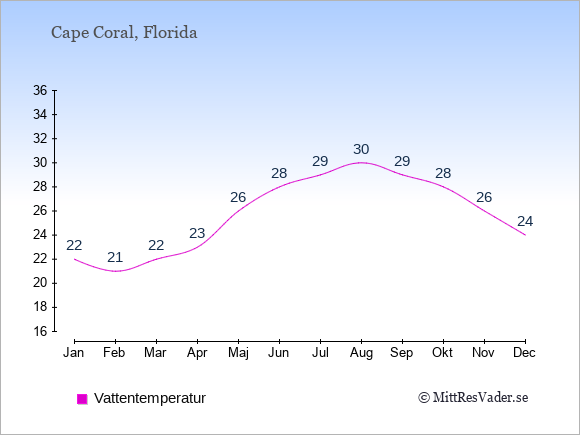 Om du vill veta hur vädret kommer att bli de kommande dagarna, kan du även se en väderprognos för Cape Coral med den aktuella vattentemperatur just nu under: Väder Cape Coral.
