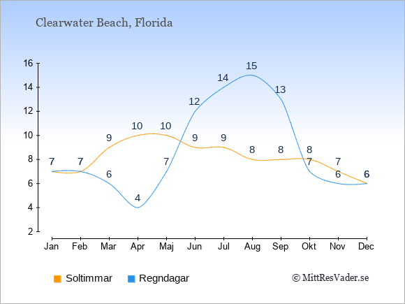 Grafen visar det genomsnittliga antalet soltimmar i Clearwater Beach under en viss månad (soltimmar är det antalet timmar per dag där solen skinnar), och antalet regndagar (dvs. det genomsnittliga antalet dagar