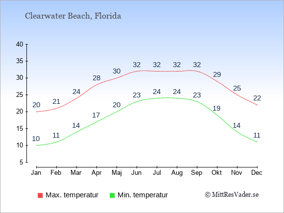 För att se hur vädret i Clearwater Beach skiljer sig från vädret hemma, kan du också jämföra siffrorna måned för måned med motsvarande siffror för Sverige under samma period här: Clearwater Beachs klimat.