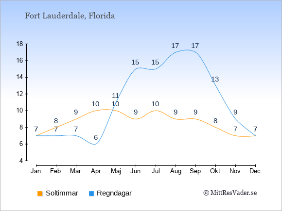 Grafen visar det genomsnittliga antalet soltimmar i Fort Lauderdale under en viss månad (soltimmar är det antalet timmar per dag där solen skinnar), och antalet regndagar (dvs. det genomsnittliga antalet dagar