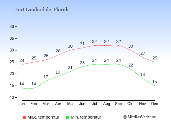 Grafen visar de genomsnittligt högsta temperaturerna i Fort Lauderdale (vanligtvis det värde som uppmätts mitt på dagen) och de genomsnittligt lägsta temperaturer (vanligtvis tidpunkten just innan soluppgång).