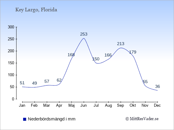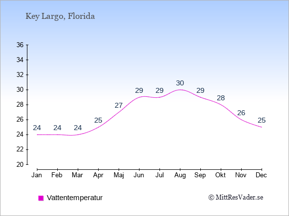 För att se hur vädret i Key Largo skiljer sig från vädret hemma, kan du också jämföra siffrorna måned för måned med motsvarande siffror för Sverige under samma period här: Key Largos klimat.