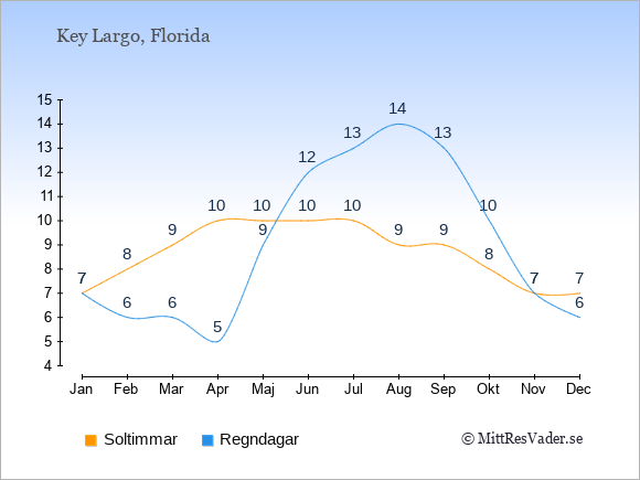 Grafen visar det genomsnittliga antalet soltimmar i Key Largo under en viss månad (soltimmar är det antalet timmar per dag där solen skinnar), och antalet regndagar (dvs. det genomsnittliga antalet dagar