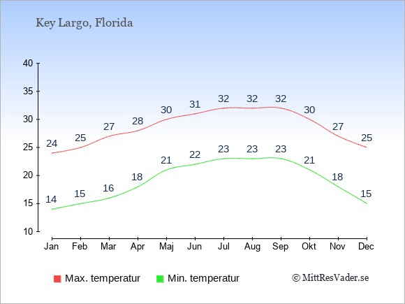 Grafen visar de genomsnittligt högsta temperaturerna i Key Largo (vanligtvis det värde som uppmätts mitt på dagen) och de genomsnittligt lägsta temperaturer (vanligtvis tidpunkten just innan soluppgång).