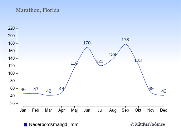 För att se hur vädret i Marathon skiljer sig från vädret hemma, kan du också jämföra siffrorna måned för måned med motsvarande siffror för Sverige under samma period här: Marathons klimat.