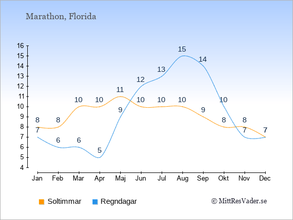 Grafen visar det genomsnittliga antalet soltimmar i Marathon under en viss månad (soltimmar är det antalet timmar per dag där solen skinnar), och antalet regndagar (dvs. det genomsnittliga antalet dagar