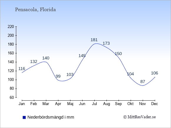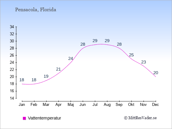 För att se hur vädret i Pensacola skiljer sig från vädret hemma, kan du också jämföra siffrorna måned för måned med motsvarande siffror för Sverige under samma period här: Pensacolas klimat.