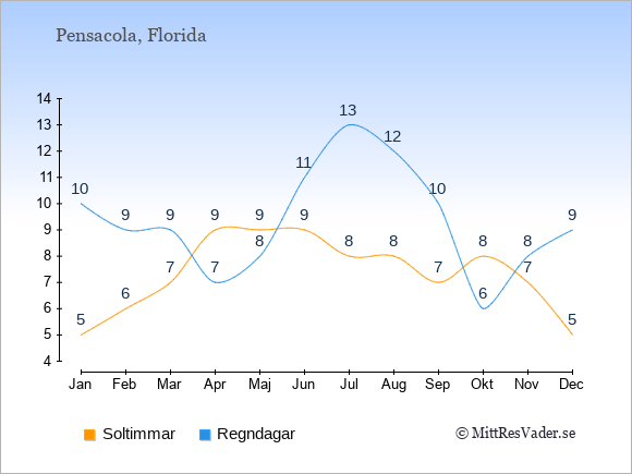 Grafen visar det genomsnittliga antalet soltimmar i Pensacola under en viss månad (soltimmar är det antalet timmar per dag där solen skinnar), och antalet regndagar (dvs. det genomsnittliga antalet dagar