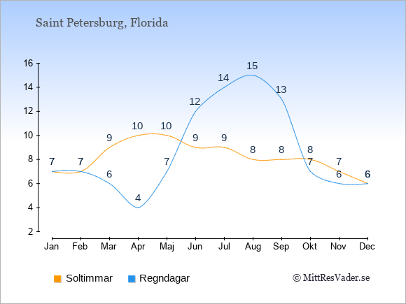 Grafen visar det genomsnittliga antalet soltimmar i Saint Petersburg under en viss månad (soltimmar är det antalet timmar per dag där solen skinnar), och antalet regndagar (dvs. det genomsnittliga antalet dagar