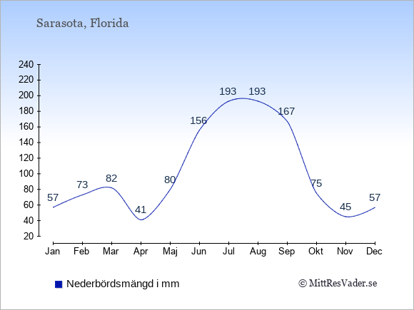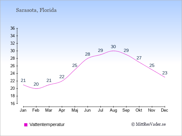 För att se hur vädret i Sarasota skiljer sig från vädret hemma, kan du också jämföra siffrorna måned för måned med motsvarande siffror för Sverige under samma period här: Sarasotas klimat.