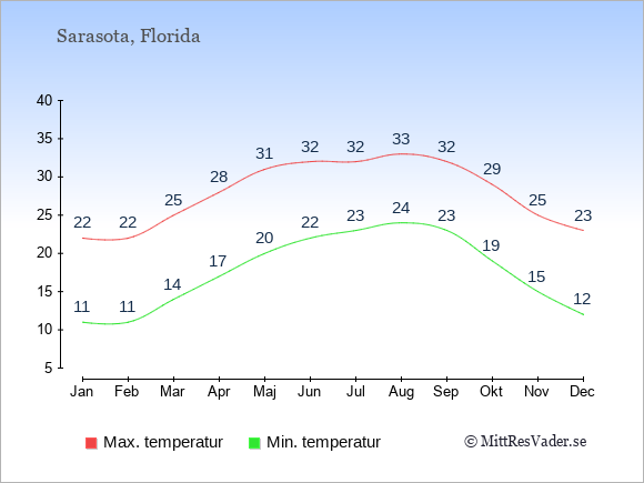 Grafen visar de genomsnittligt högsta temperaturerna i Sarasota (vanligtvis det värde som uppmätts mitt på dagen) och de genomsnittligt lägsta temperaturer (vanligtvis tidpunkten just innan soluppgång).