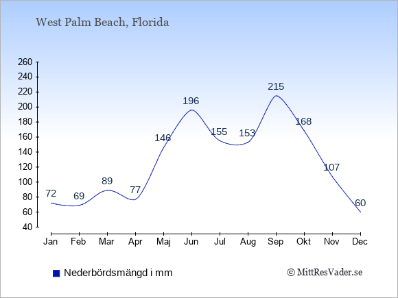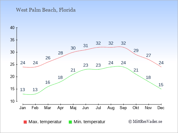 För att se hur vädret i West Palm Beach skiljer sig från vädret hemma, kan du också jämföra siffrorna måned för måned med motsvarande siffror för Sverige under samma period här: West Palm Beachs klimat.