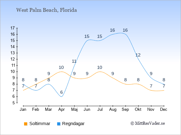 Grafen visar det genomsnittliga antalet soltimmar i West Palm Beach under en viss månad (soltimmar är det antalet timmar per dag där solen skinnar), och antalet regndagar (dvs. det genomsnittliga antalet dagar