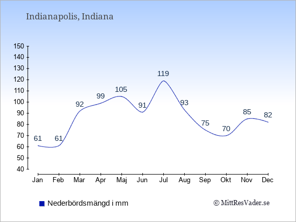 För att se hur vädret i Indianapolis skiljer sig från vädret hemma, kan du också jämföra siffrorna måned för måned med motsvarande siffror för Sverige under samma period här: Indianapolis klimat.
