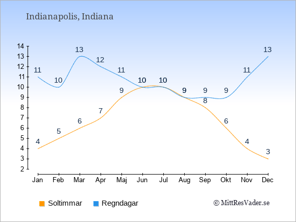 Grafen visar det genomsnittliga antalet soltimmar i Indianapolis under en viss månad (soltimmar är det antalet timmar per dag där solen skinnar), och antalet regndagar (dvs. det genomsnittliga antalet dagar