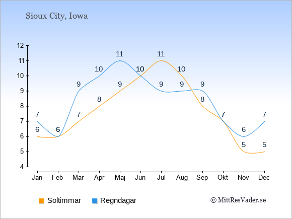 Ska man ut och resa, har Sioux City det bästa klimatet i de månader, där det finns många soltimmar og få regndagar.