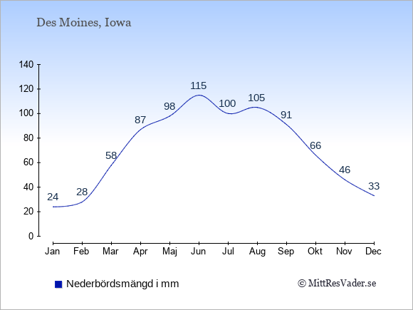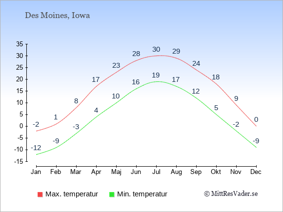För att se hur vädret i Des Moines skiljer sig från vädret hemma, kan du också jämföra siffrorna måned för måned med motsvarande siffror för Sverige under samma period här: Des Moines klimat.
