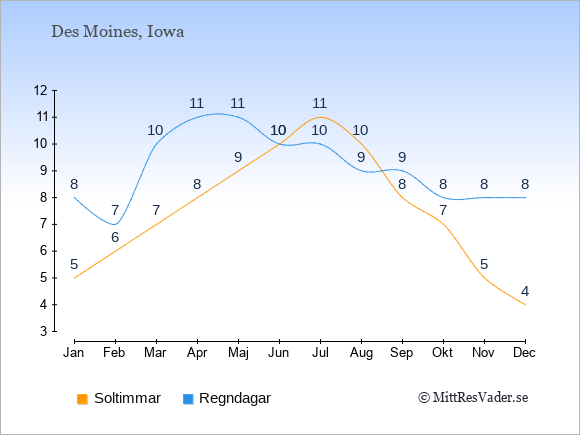 Väder i Des Moines: Soltimmar och regndagar