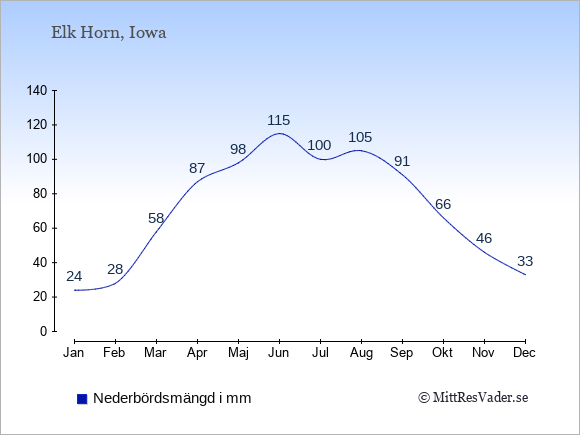 För att se hur vädret i Elk Horn skiljer sig från vädret hemma, kan du också jämföra siffrorna måned för måned med motsvarande siffror för Sverige under samma period här: Elk Horns klimat.