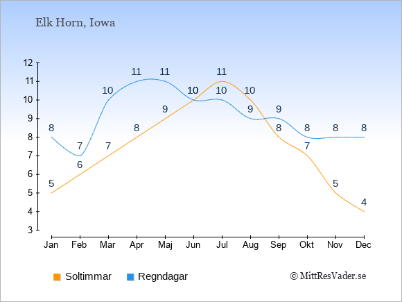 Grafen visar det genomsnittliga antalet soltimmar i Elk Horn under en viss månad (soltimmar är det antalet timmar per dag där solen skinnar), och antalet regndagar (dvs. det genomsnittliga antalet dagar