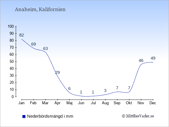 För att se hur vädret i Anaheim skiljer sig från vädret hemma, kan du också jämföra siffrorna måned för måned med motsvarande siffror för Sverige under samma period här: Anaheims klimat.