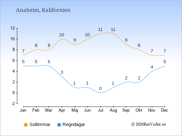 Grafen visar det genomsnittliga antalet soltimmar i Anaheim under en viss månad (soltimmar är det antalet timmar per dag där solen skinnar), och antalet regndagar (dvs. det genomsnittliga antalet dagar