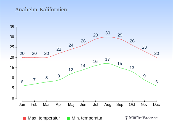 Grafen visar de genomsnittligt högsta temperaturerna i Anaheim (vanligtvis det värde som uppmätts mitt på dagen) och de genomsnittligt lägsta temperaturer (vanligtvis tidpunkten just innan soluppgång).