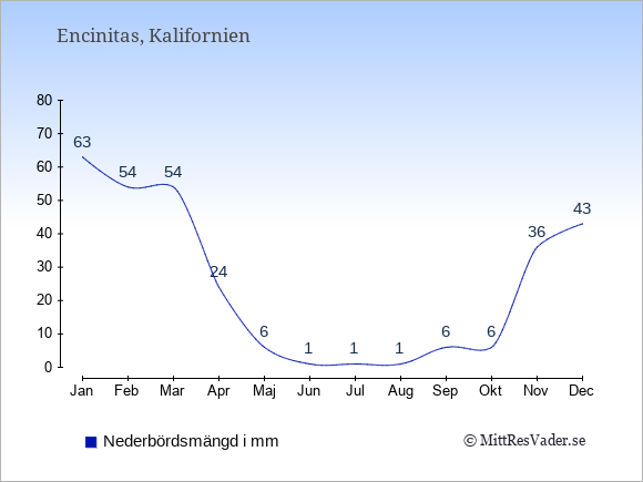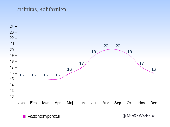 För att se hur vädret i Encinitas skiljer sig från vädret hemma, kan du också jämföra siffrorna måned för måned med motsvarande siffror för Sverige under samma period här: Encinitas klimat.