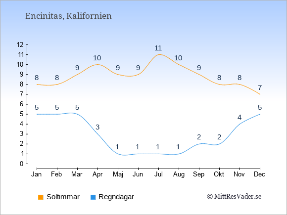 Grafen visar det genomsnittliga antalet soltimmar i Encinitas under en viss månad (soltimmar är det antalet timmar per dag där solen skinnar), och antalet regndagar (dvs. det genomsnittliga antalet dagar