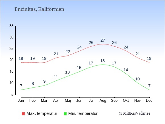 Grafen visar de genomsnittligt högsta temperaturerna i Encinitas (vanligtvis det värde som uppmätts mitt på dagen) och de genomsnittligt lägsta temperaturer (vanligtvis tidpunkten just innan soluppgång).