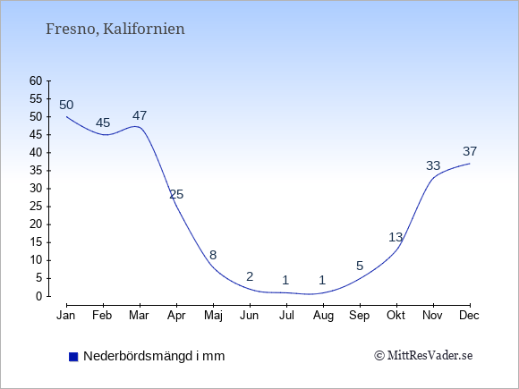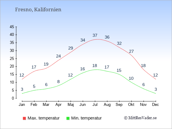 För att se hur vädret i Fresno skiljer sig från vädret hemma, kan du också jämföra siffrorna måned för måned med motsvarande siffror för Sverige under samma period här: Fresnos klimat.